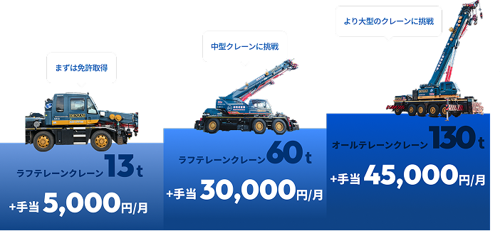 入社後1年以内を目安に、移動式クレーンや大型特殊免許などを取得。